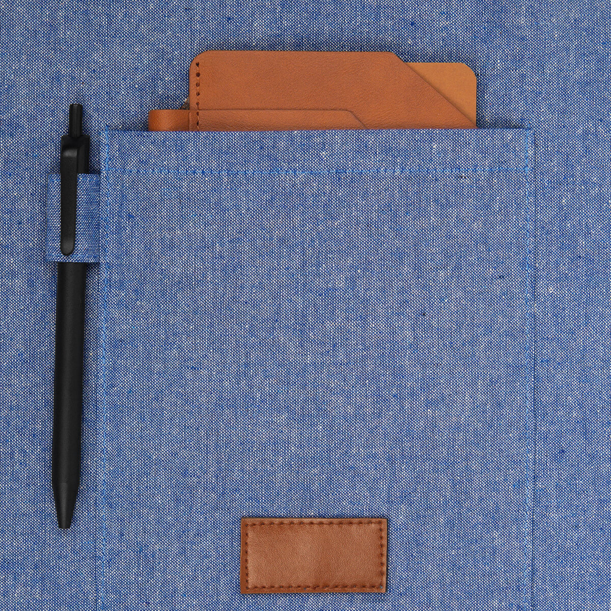 Bolsa ecológica de algodón con fuelle y asas. Incluye una bolsa frontal que estiliza el diseño, acompañada de un parche decorativo de PU.