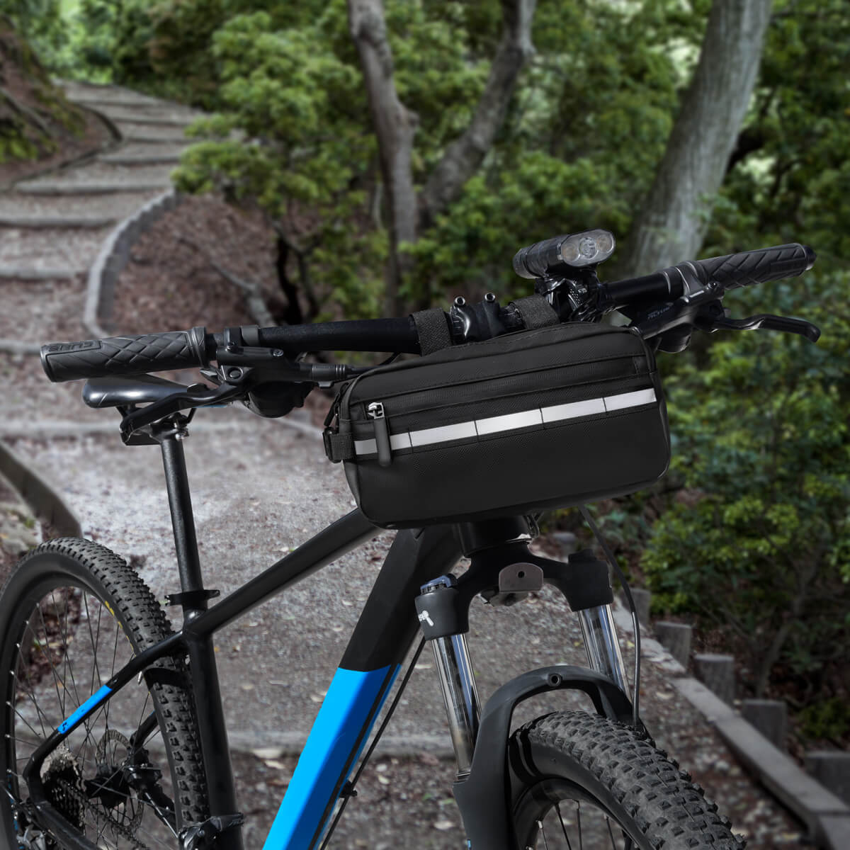 Bolsa multifuncional para bicicleta y resistente al agua, disenada para un estilo de vida activo. Se adapta facilmente al cuadro de tu bicicleta o puede usarse como bolsa crossbody para mayor versatilidad. Ofrece almacenamiento practico con un bolsillo frontal y un compartimento principal espacioso con bolsillos internos para organizar tus objetos esenciales. Su banda reflejante mejora la seguridad en trayectos nocturnos o con poca luz.