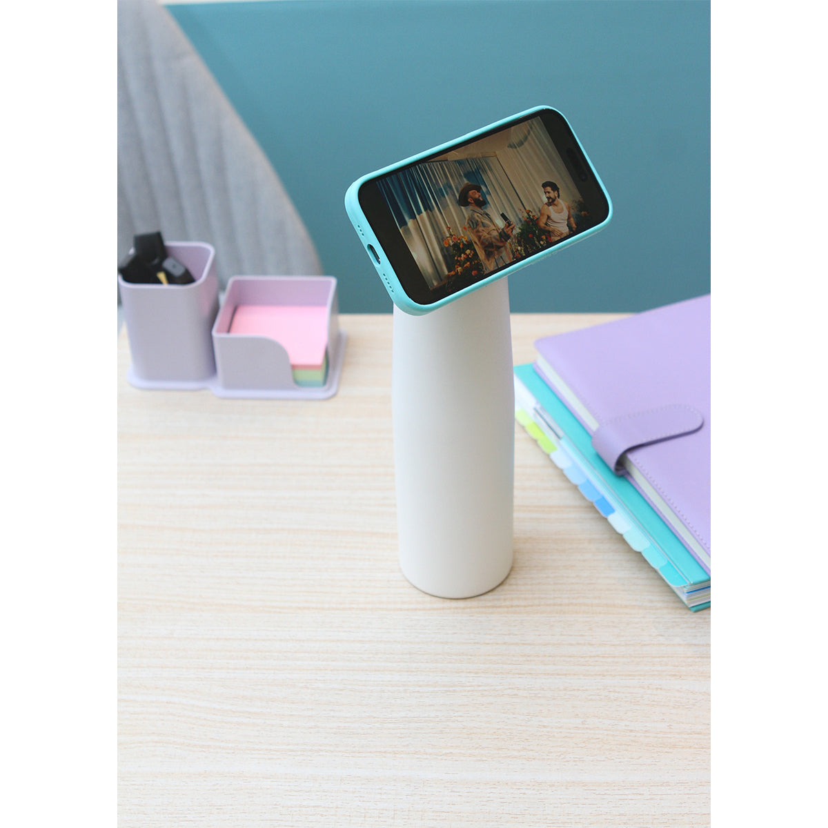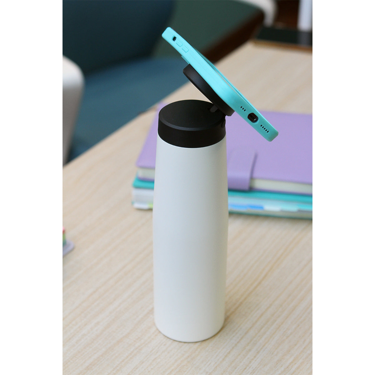 Termo de doble pared fabricado en acero inoxidable con recubrimiento en polvo, con tapa de polipropileno con función de soporte magnético para el teléfono. Resistente y seguro, ideal para mantener la temperatura de tus bebidas mientras te acompaña en tu rutina diaria. Capacidad de 550 ml.