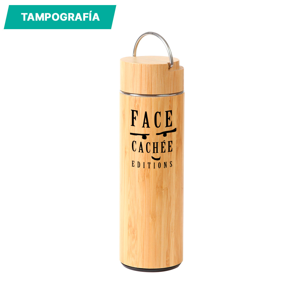 Termo doble pared fabricado en acero inoxidable con recubrimiento exterior de bambú; rejilla metálica y asa en la tapa. Fabricado con materiales de grado alimenticio, mantiene bebidas frías o calientes por un largo tiempo, no usar en microondas, capacidad 450 ml. Incluye caja de cartón individual.